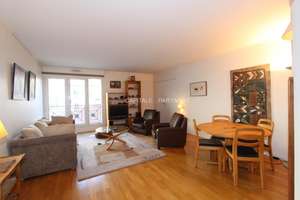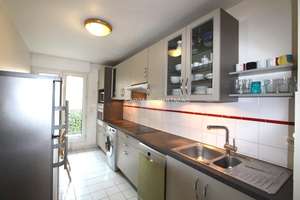 95 sqm, 3rd floor, modern building, lift/elevator, entrance, living room (sofa bed)/dining room, 3 bedrooms (double bed, sofa bed), marble bathroom, shower room, separated toilet, fully equipped kitchen (WM, DW, ovens) ; electric heating, double glazing, modern furniture, wardrobes, TV, good condition, wooden floor, carpeting, bright, quiet, dble exposure, balcony, garage, lively area