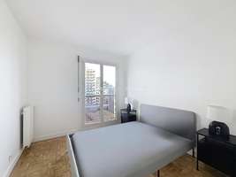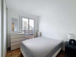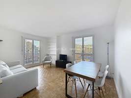 CIVIL LEASE, SOCIETY, SECONDARY RESIDENCE ONLY - 59 sqm, 6th floor, modern building, lift/elevator, entrance, living room with dining corner, 2 bedrooms (double beds), bathroom, seprated toilet, equipped kitchen (WM, ovens); central heating + hot water, modern furniture, closets, TV, wooden floor, bright, quiet, modern, balcony, view on Eiffel Tower, garage included