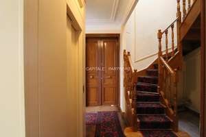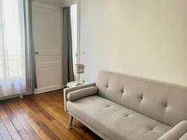 110 sqm, 5th floor, 19th century stone building, lift/elevator, entrance, living room, dining room, 3 bedrooms (double bed, sofa bed, convertible bedroom), bathroom/shower room, separated toilet, fully equipped kitchen (WM/dryer, DW, ovens); gas heating, good mixed furniture, closets, TV, good condition, wooden fl., mouldings, fireplace, for family, balcony, view on Eiffel Tower!