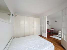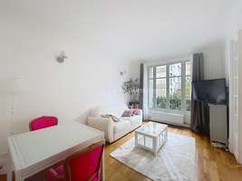 67 sqm, 1st floor on courtyard, 1930 old building, lift/elevator, entrance, double living room/dining room (+ sofa bed), 1 bedroom (double bed), bathroom (+ washing machine and dryer), separated toilets, equipped kitchen (DW, ovens); central heating + hot water, modern furniture, wardrobes, TV, good condition, wooden floor, light, quiet, charm, on courtyard, garage