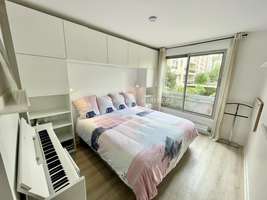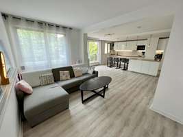 Rue Fourcher Lepelletier, 4-room 98 m2 apartment on the 1st floor of building with elevator, entrance, living/dining room opening onto garden, 3 bedrooms (double, single beds), bathroom, shower room, separate toilet, equipped open kitchen (LV, LL, oven), communal heating, double glazing, good furniture, plenty of storage space, balconies, good condition, bright, quiet, double parking