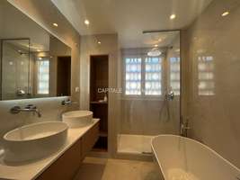 108 sqm, 6th and last floor, modern building, elevator, guardian, on a private garden, furnished 2 bedrooms appartment, high standing, entrance with wardrobes, living / dining room on a 10sqm terrace, master bedroom with a private dressing, shower room + bath and separated toilet , second bedroom with a shower room and toilet, fully equipped kitchen + laundry area ; central heating + hot water, air conditioning, bright, calm, Place de Bagatelle, possibility of parking, to visit asap !