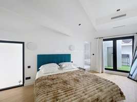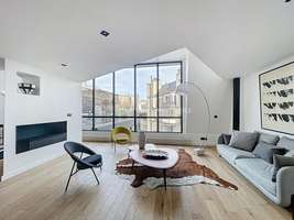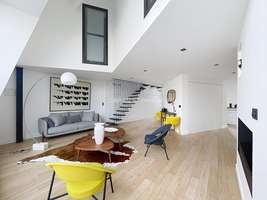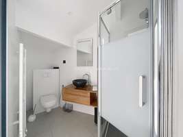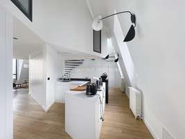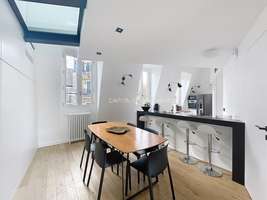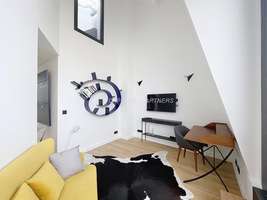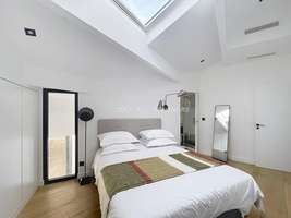 120m² loft, 4th floor, luxury building, no elevator, entrance hall, living room, dining room, TV corner, open kitchen with dining area, ample storage space, 1 bedroom with en suite bathroom, 1 bedroom with en suite shower room, 3 WC, Renovated in 2025, reversible air conditioning, 25m² terrace, quiet, sunny, building with concierge services, charges including water, electricity, internet, and heating